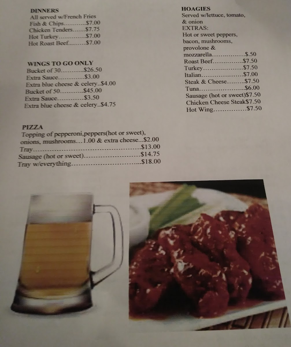 Here, you can find delicious options like the Fish Filet Sandwich for just $4.00 and the hearty Sausage Hoagie, available in hot or sweet styles for $6.00. Don't miss out on their famous chicken wings, a crowd favorite, perfect for wing nights on Tuesdays and Thursdays.